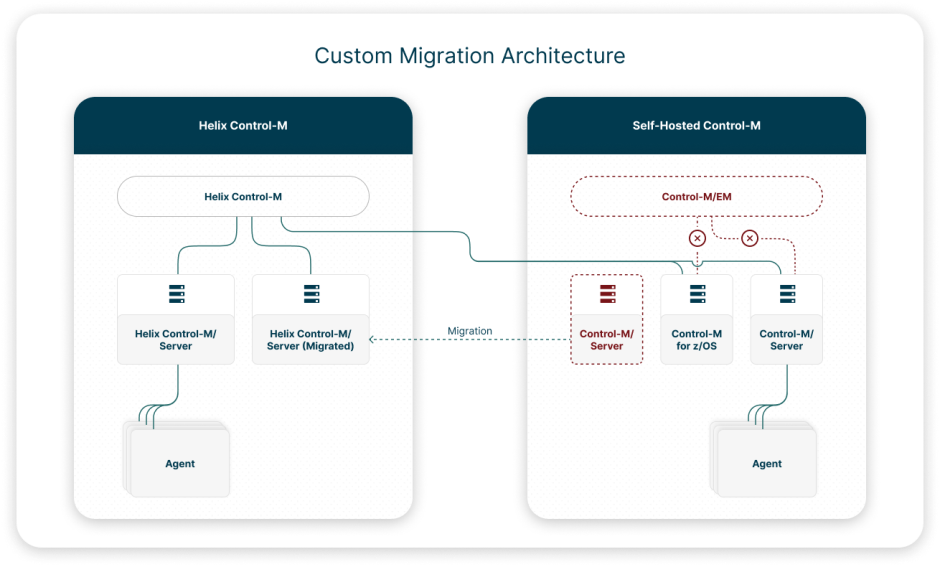 Helix Control-M Full Migration: Migrates your Control-M/EM data and all Control-M/Servers to Helix Control-M. This eliminates the need to install and maintain Control-M/EM, Control-M/Servers, and their associated databases.
