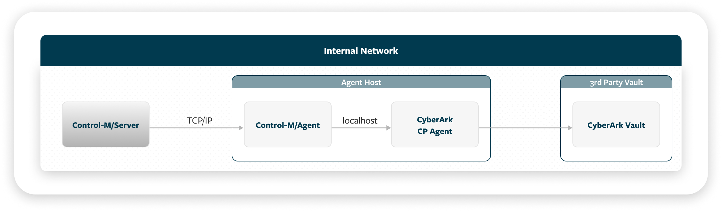 You can integrate Control-M with a CyberArk vault where you store and manage sensitive information (called secrets), such as passwords, access keys, or security keys. This integration enables Control-M/Agents to retrieve secrets from your vault only when they connect to your plug-in application servers and run jobs, so that sensitive information is not saved in Control-M components. Communication with the CyberArk vault can be either SDK communication through a local Credential provider (CP) installed on the Control-M/Agent host machine or REST communication through a central Credential Provider (CCP).